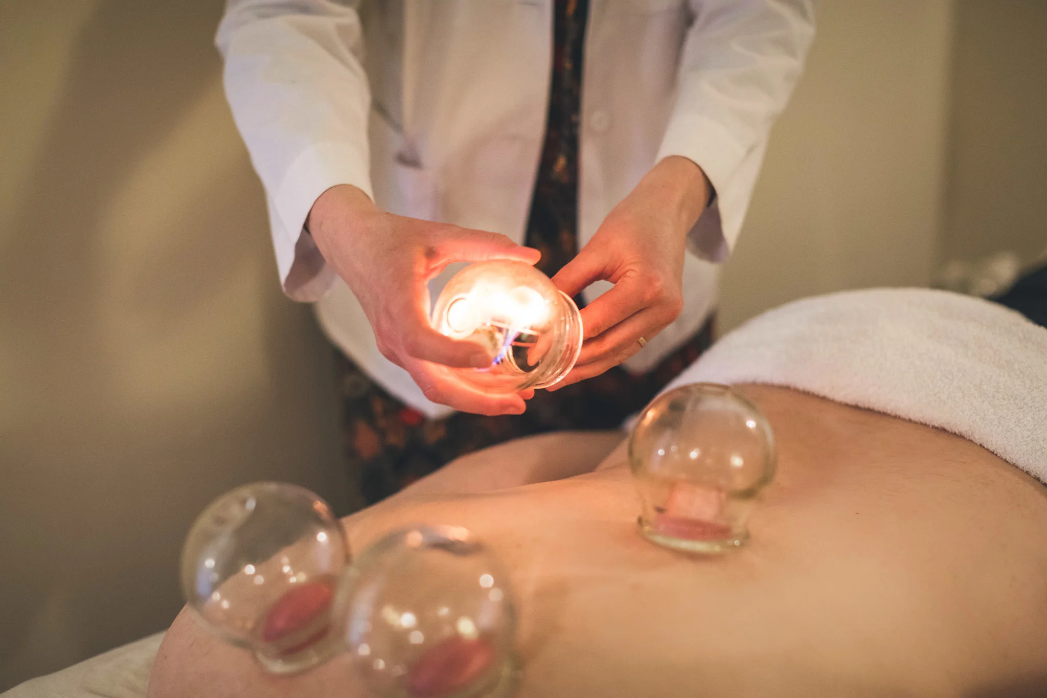 is used to break up stagnation in muscles and soft tissue. Fire cupping involves the use of glass cups which are heated with a flame to create a suctioning effect. The cups are then place on the area being treated (typically the back), and the tight muscle / flesh is sucked into the cup. The cups are then either left in place for several minutes, or they are moved via sliding technique to a new area of skin. This suctioning effect can be very helpful to to release tight muscles and to draw blood to the area in order that healing can occur. It also has detoxification properties, drawing harmful toxins out of the skin. Please note that although cupping does not hurt, it can leave bruises on the area being cupped.