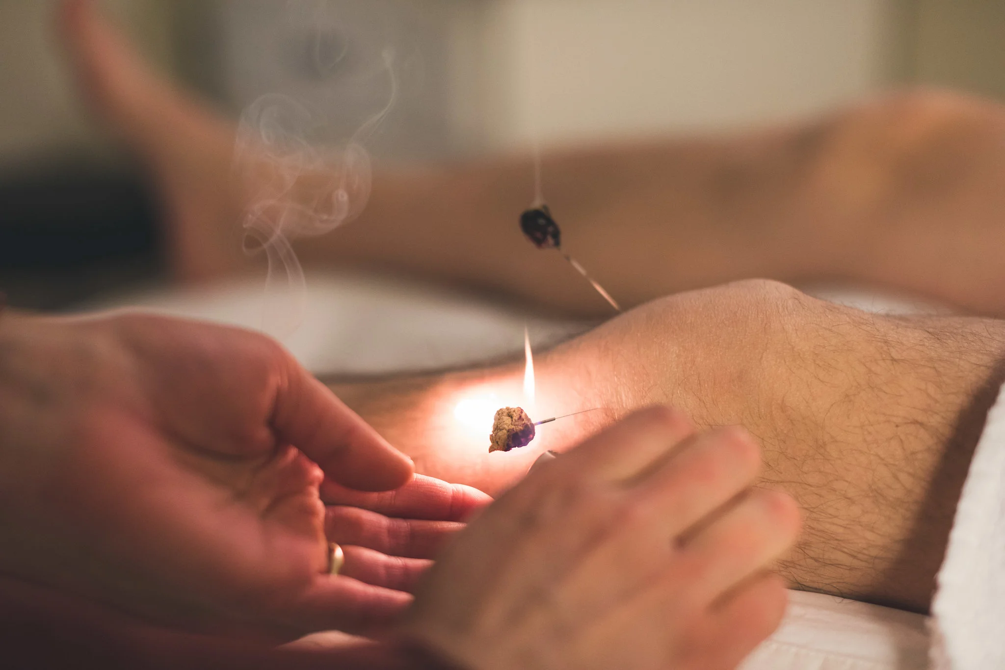 (sometimes referred to as “moxa”) is the burning of the herb Mugwort (also known as “Ai Ye”) over certain appropriate acupuncture points. In addition to the therapeutic heat this procedure provides, medicinal qualities of the burning herb also help to correct imbalances in the body. Moxibustion is applied in a number of different ways, including burning the herb on needles that are inserted in the body. Other ways of application are to use a moxa stick to indirectly apply heat to acupuncture points, or burning the herb on a medium such as fresh ginger or garlic, which rests on the skin.
